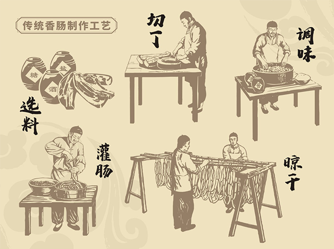 北魏·賈思勰《齊民要術(shù)》—灌腸法:“取羊盤腸,凈洗治。細銼羊肉,令如籠肉,細切蔥白、鹽、豉汁、姜、椒末調(diào)和,令咸淡適口,以灌腸。兩條夾而炙之。割食甚香美?!边@是有據(jù)可查的最早關(guān)于香腸工藝的史料記載。