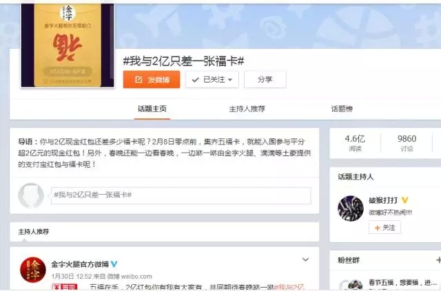 自前幾天支付寶將“集5福,搶2億+紅包”的活動(dòng)規(guī)則公布后,一時(shí)間,有關(guān)福卡換贈(zèng)的話題強(qiáng)行霸屏。在有金字粉絲集齊了五福后,金字順勢(shì)在微博平臺(tái)上策劃的#我與2億只差一張???的微話題就引發(fā)了高達(dá)4.6億的閱讀量,網(wǎng)友們通過點(diǎn)贊評(píng)論及轉(zhuǎn)發(fā)分享的方式,第一時(shí)間表達(dá)了自己對(duì)于五福??ê痛和?億紅包的高度期待!