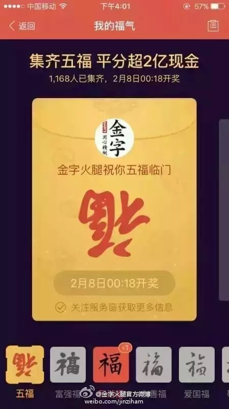 通過咻一咻為大家派現(xiàn)金紅包和???,不管你是缺和諧福、富強(qiáng)福、愛國福、友善福還是傳說中的敬業(yè)福,到時(shí)候都可以通過支付寶咻一咻獲得哦,平分2億+現(xiàn)金大獎(jiǎng)。猴年春晚期間,大家不僅可以領(lǐng)到金字火腿發(fā)放的福卡,還可以領(lǐng)到金字的現(xiàn)金紅包哦!