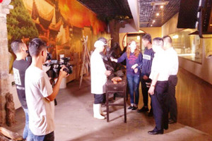在《常中丞筆記》中,火腿叫做蘭熏,《東陽縣志》稱熏蹄,《本草求原》稱南腿,由此可觀,火腿此物名聲深遠,頗受眾人喜愛,不然也不會有如此多的“小名”。 10月17日這天,浙江經(jīng)視旅游節(jié)目《48小時》攝制組團隊在中國火腿博覽館、世界火腿博覽館開始了“火腿”的探索之旅,從起源伊始談至繁華盛宴,期間故事種種萬千。 從中國火腿博覽館入口處的“百姓勞軍圖”便開始了這場對話。而在博覽館內的火腿制作流程雕塑則完全將攝制組吸引,無論是考驗刀工的制作火腿頭道工序——修胚,還是考驗“鹽功”的——上鹽環(huán)節(jié),都深